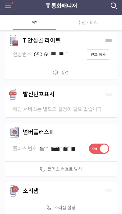 T 통화매니저 앱에서 안심번호로 걸려온 전화 내역도 확인 가능하고 발신 방법 설정도 가능합니다.